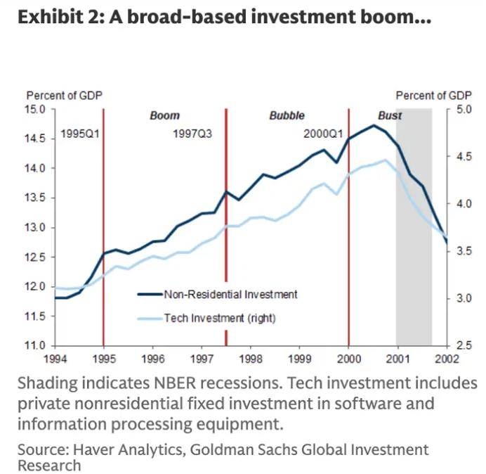 根据高盛的分析,在互联网泡沫破灭前的几个月里,投资支出开始下滑。
